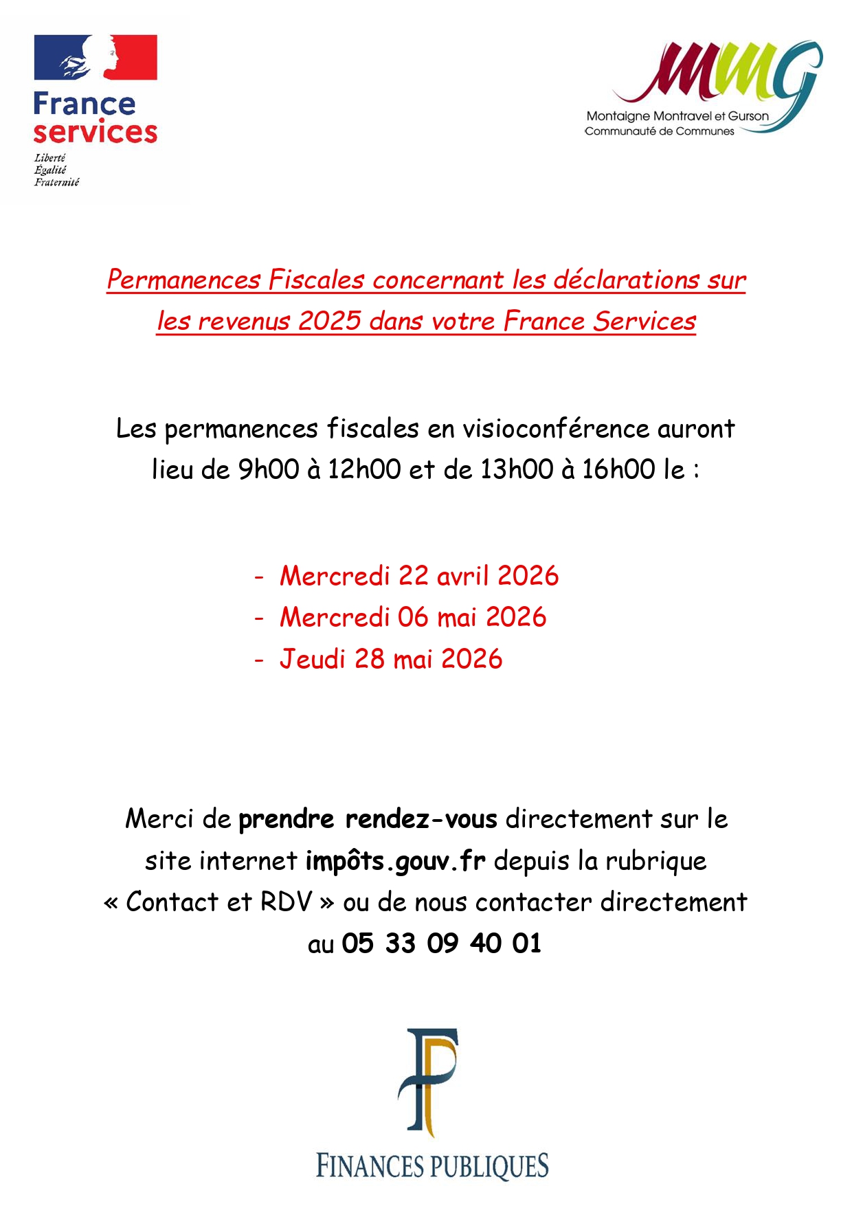Merci de prendre rendez-vous directement sur le site internet impôts.gouv.fr depuis la rubrique « Contact et RDV » ou de nous contacter directement au 05 33 09 40 01